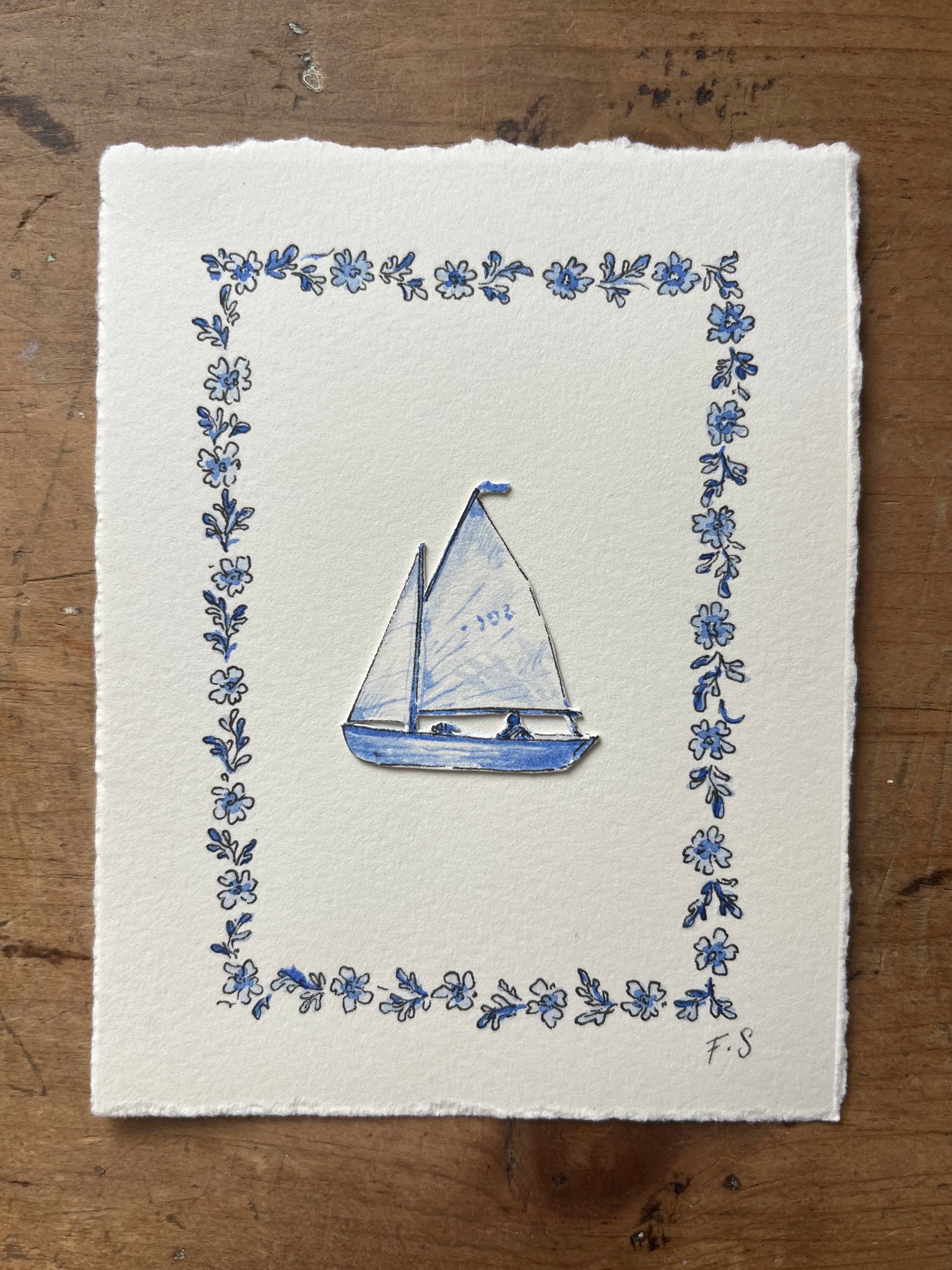Blue and White Papercut mounted on cotton paper.