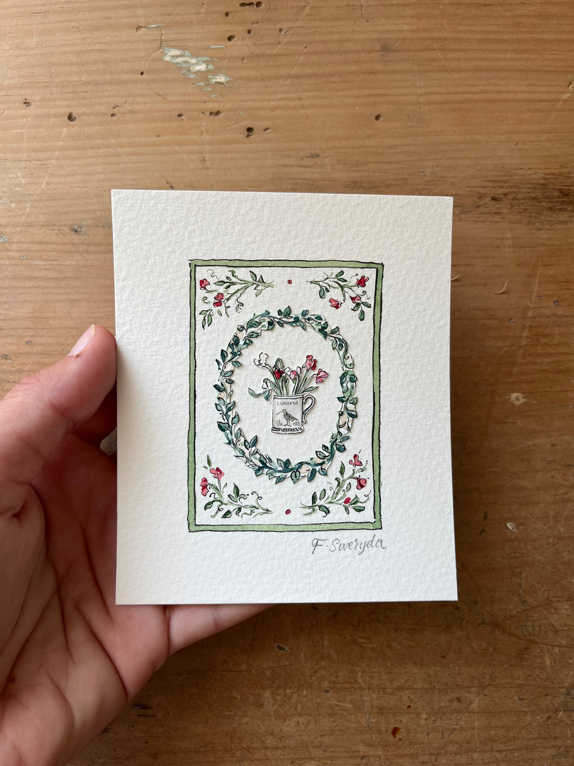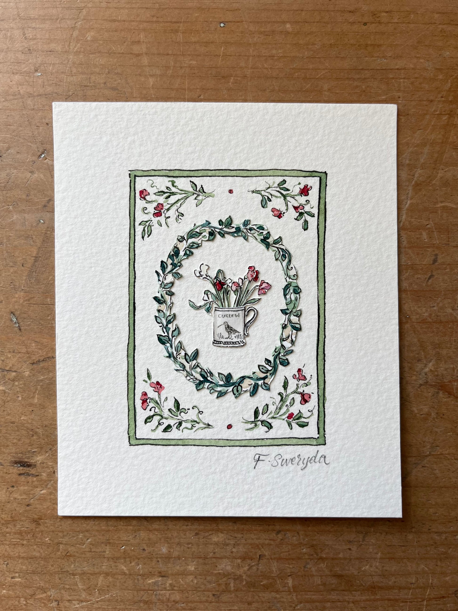 Miniature papercut Sweet Peas in a curlew mug, mounted on cotton paper.